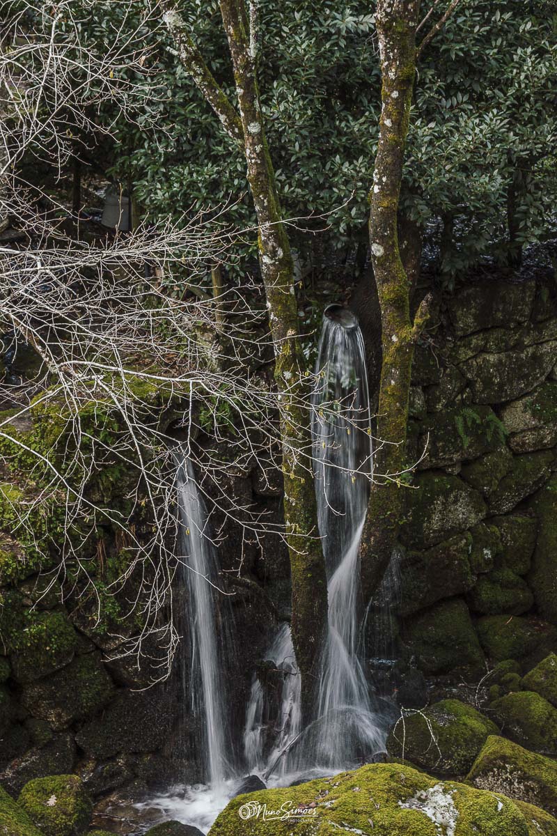 A imagem mostra uma pequena cascata a fluir entre duas árvores cobertas de musgo, num cenário florestal denso e sereno. A água emerge discretamente de um tubo embutido na encosta, revelando uma intervenção humana subtil integrada na paisagem natural. As rochas e o solo estão cobertos por musgo e folhas caídas, enquanto ramos nus sugerem uma transição sazonal, possivelmente entre inverno e primavera. A vegetação verde vibrante ao fundo reforça a sensação de frescura e biodiversidade. Esta composição equilibra natureza e engenharia discreta, sendo ideal para conteúdos sobre gestão sustentável da água, fotografia de natureza ou ecologia florestal. A tranquilidade do cenário convida à contemplação e à valorização dos ecossistemas resilientes.