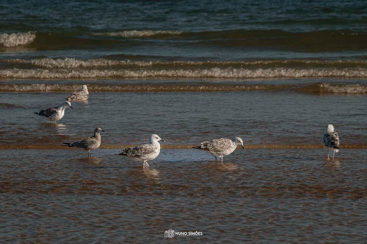 A imagem mostra um grupo de cinco gaivotas em diferentes posições à beira-mar. Quatro gaivotas estão na água rasa, com as suas patas submersas, enquanto uma quinta gaivota está mais à distância, na areia, perto das ondas. As aves, com a sua plumagem branca e cinzenta, estão dispostas em diferentes direções, algumas parecendo estar a caminhar e outras paradas. A água do mar, com a sua tonalidade escura e as ondas em segundo plano, reflete a luz do sol, criando um contraste interessante com os pássaros. A areia molhada e a água formam um ambiente natural e tranquilo. As Gaivotas em Harmonia transmitem uma sensação de calma e de vida selvagem na praia.