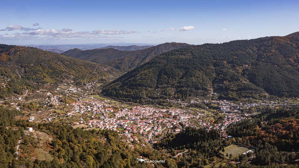 A imagem aérea revela a vila de Manteigas encaixada entre montanhas e florestas densas, com vegetação em tons outonais. As casas, agrupadas e com telhados vermelhos, contrastam com o verde e dourado da paisagem envolvente. Estradas sinuosas ligam diferentes partes da aldeia e estendem-se pelo campo, sugerindo acessibilidade e ligação com a natureza. O céu azul com nuvens dispersas ilumina suavemente o cenário, realçando os detalhes arquitetónicos e naturais. A composição transmite harmonia entre o ambiente construído e o território montanhoso, sendo ideal para promover turismo rural, arquitetura tradicional ou contemplação paisagística em regiões serranas.
