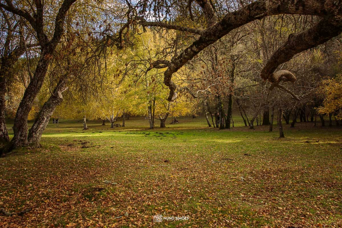 A foto retrata um parque ou bosque aberto durante o outono. A cena é caracterizada por uma vasta área de relva verde salpicada por inúmeras folhas secas e castanhas caídas das árvores. As árvores, com troncos robustos e galhos retorcidos, exibem uma folhagem predominantemente amarela e dourada, embora algumas já estejam despidas de folhas, revelando seus galhos escuros contra o céu. A luz do sol incide sobre a cena, criando áreas de luz e sombra na relva e realçando as cores quentes do outono. Em segundo plano, vislumbram-se mais árvores e, à esquerda, o que parecem ser bancos de piquenique, sugerindo que este é um local de lazer e descanso.